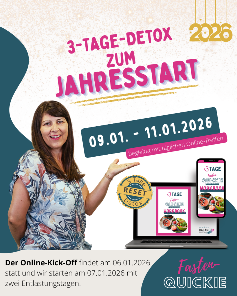 Gerade zum Jahresstart brauchen wir oft einen extra Motivationsschub. Deshalb biete ich im Jänner mein 3-tägiges Detoxprogramm, den begleiteten Fasten-Quickie, an. Das ist einer der vier exklusiven Termine im Jahr, an denen wir gemeinsam in der Gruppe mittels Basenfasten entgiften.